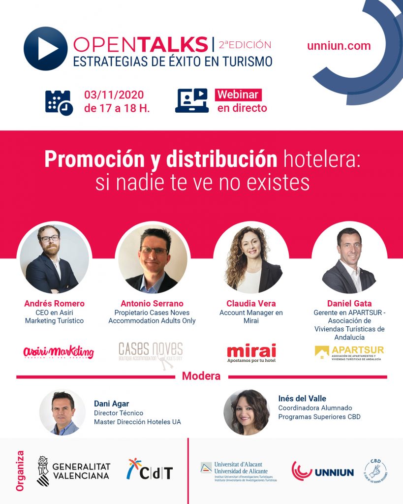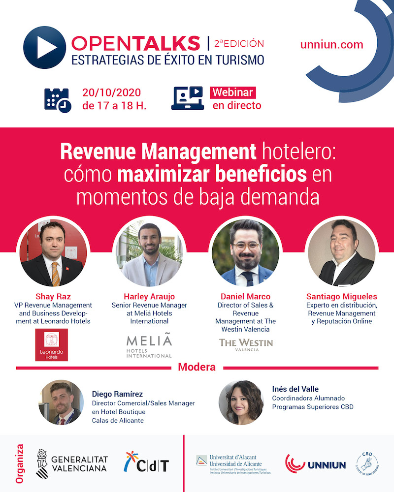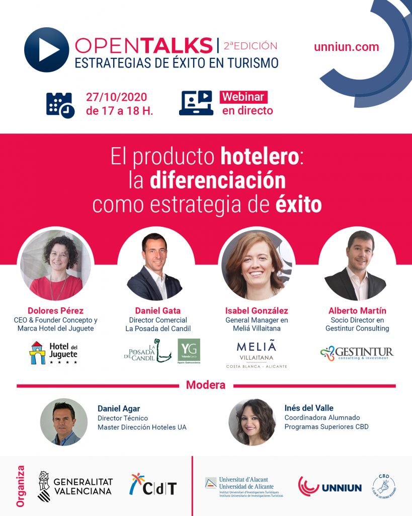 El Club de las Buenas Decisiones, en colaboración con la dirección académica del Experto en Dirección Comercial de Hoteles de la Universidad de Alicante, organiza un ciclo de 6 webinars «Open Talks- Estrategias de éxito en Turismo» con entrevistas a grandes referentes del sector hotelero.